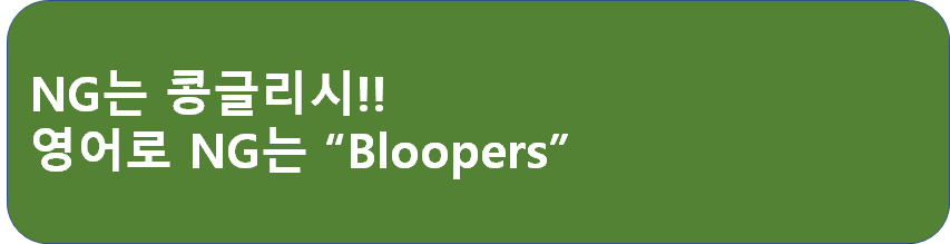 NG는 영어로 Bloopers입니다. 단수로 blooper라고 쓰면 "실수"입니다. 실수 중에서도 당황스러운 실수를 blooper라고 합니다. 발음은 "블루펄~"이렇게 해주시면 되고요.